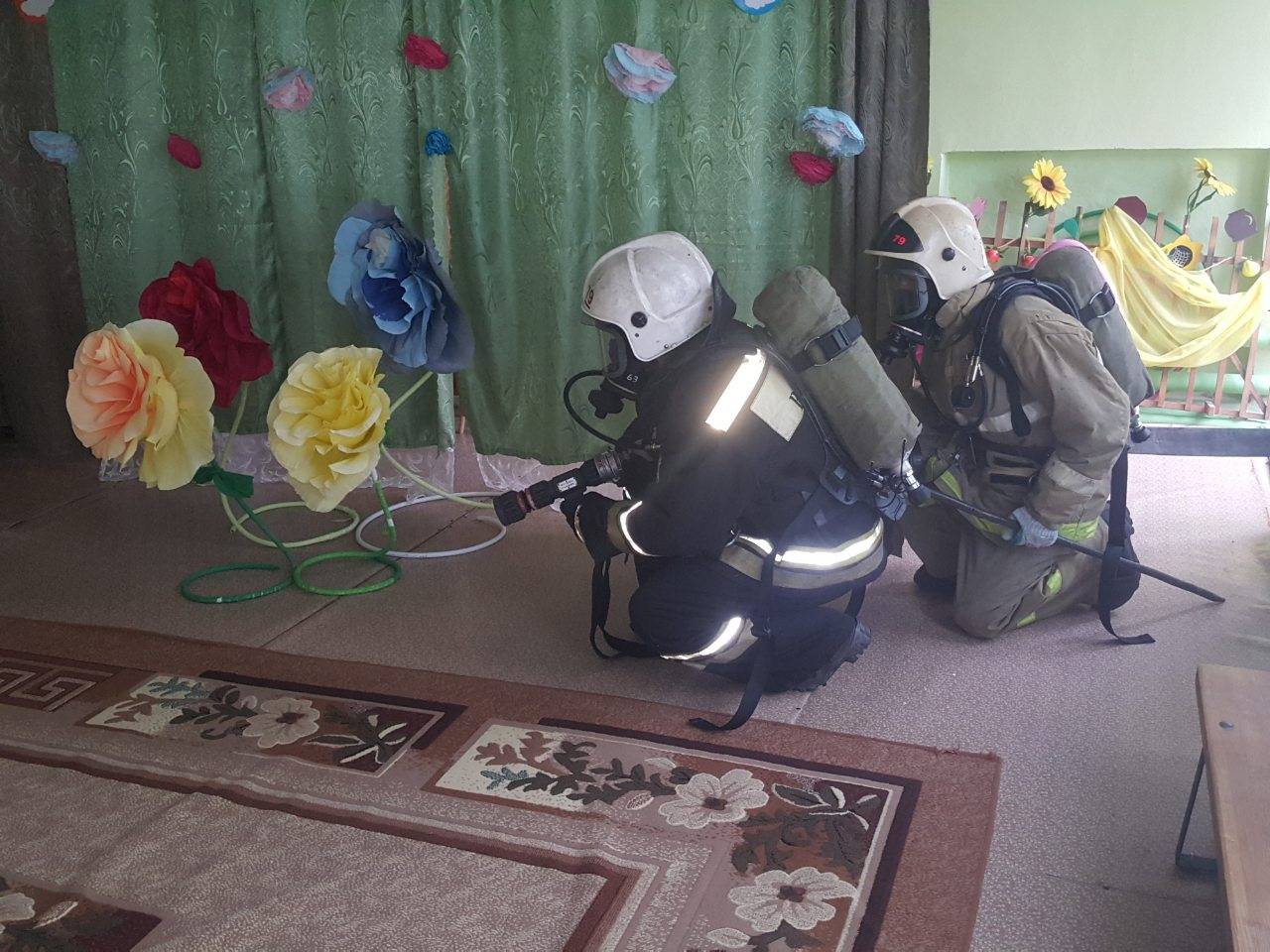 По легенде одного из учений из-за короткого замыкания в электросети загорелась мебель в раздевалке одной из групп детского сада. Подразделения пожарной охраны, прибывшие на место вызова, незамедлительно приступили к ликвидации условного возгорания.